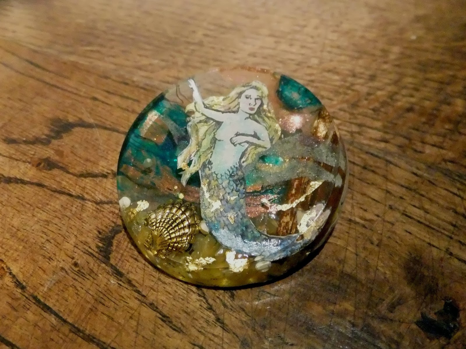 They are the size of conventional badges, and about half an inch thick in clear resin, with embedded drawings, paint, beads, and couscous impersonating sand. Getting the shine/clarity in photos is none too easy, especially on dark evenings, but they're pretty sparkly.