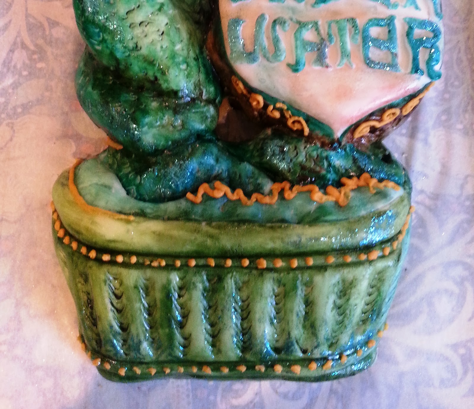 A launch party for Poems Underwater on a boat needed a cake, and mermaids were heavily involved -- commissions don't come much more enticing than that. My last mermaid was a medieval one, and I wanted to stick to the theme, but wanted to do a Melusine -- a double tailed mermaid. Her story's different wherever you read it, but her two tails are usually a punishment for seeking revenge against her father, on her mother's behalf. But her mother is enraged with Melusine for her lack of respect, so curses her to swapping her legs for two serpentine coils every Saturday; when Melusine marries, she makes her new husband promise never to enter her chamber on that day. When he breaks his promise and walks in on her soaking in a green marble tub, she turns into a dragon and flies away, leaving only two magical rings and quickly cooling bathwater behind.